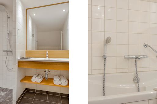 - Badeværelse med walk-in bruser, badeka, håndvask og toilet